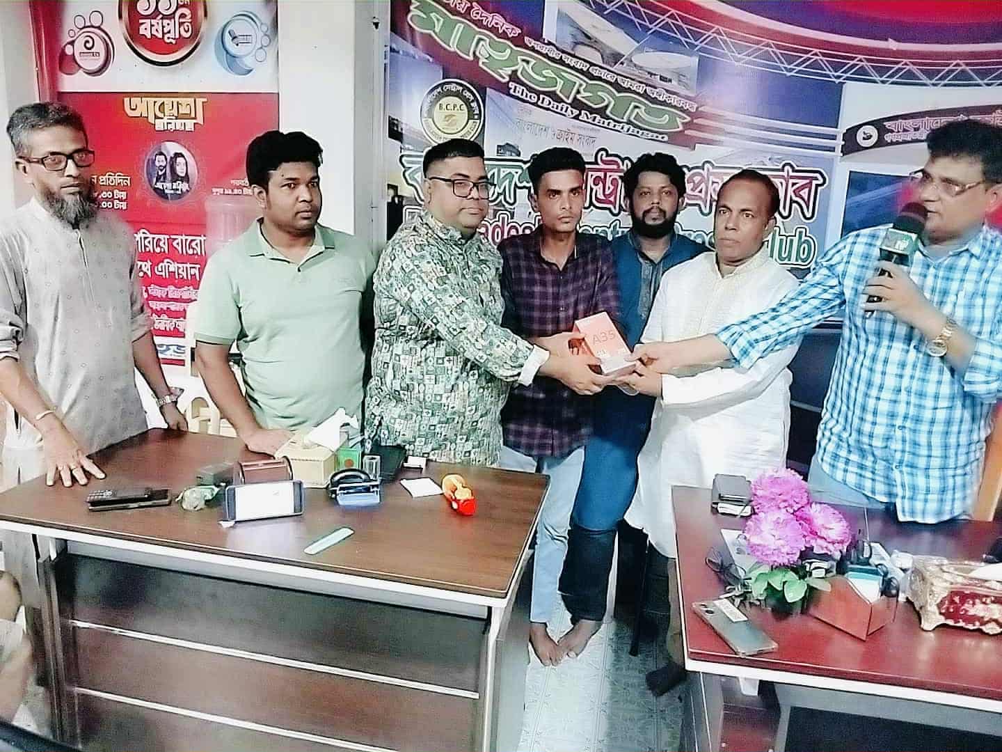 রাজধানী ঢাকার মিরপুরে ১০ নম্বর বাংলাদেশ সেন্ট্রাল প্রেস ক্লাব (B.C.P.C) কার্যালয়ে গত ২৯ আগস্ট শুক্রবার অনুষ্ঠিত জরুরি আলোচনা সভা শেষে ঝিনাইদহের নবীন শিল্পী শামীমের হাতে ১ টি নতুন মোবাইল ফোন উপহার হিসেবে তুলে দেওয়া হয়েছে।