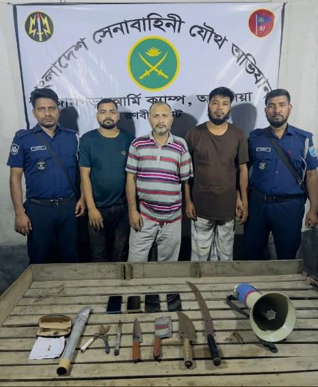 যৌথ বাহিনী জানায়, রবিবার বেলা ২টার দিকে আশুলিয়ার বাইপাইল বাসস্ট্যান্ডে চাঁদাবাজের সাথে সম্পৃক্ত দুইজনকে গ্রেপ্তার করে জামগড়া আর্মি ক্যাম্পের নিয়মিত টহল টিম। পরবর্তীতে তাদের দেওয়া স্বীকারোক্তি ও তথ্যের ভিত্তিতে তাদের নেতা টিপু সুলতান ওরফে হাতকাটা টিপুকে গ্রেপ্তার করা হয়। এ সময় তল্লাশি করে বেশিকিছু দেশীয় অস্ত্র, চাঁদাবাজি এবং বিভিন্ন সন্ত্রাসী কর্মকান্ডে ব্যবহৃত দ্রব্যাদি, মোবাইল ও বিভিন্ন অপরাধের আলামত পাওয়া যায়। আসামীদের পরবর্তীতে পুলিশের নিকট সোপর্দ করা হয়েছে এবং তাদের বিরুদ্ধে আইনানুগ ব্যবস্থা চলমান।