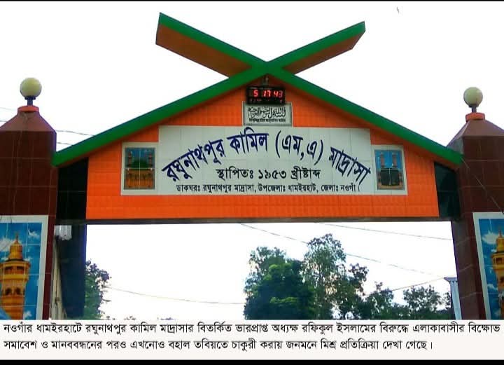 নওগাঁর ধামইরহাটে অনেক ঘটনা-অঘটনের পরও ধামইরহাট উপজেলার রঘুনাথপুর কামিল মাদরাসার ভারপ্রাপ্ত অধ্যক্ষ রফিকুল ইসলাম এখনো বহাল তবিয়তে চাকরি করছেন। গত ২১ আগষ্ট অধ্যক্ষের বিভিন্ন অনিয়ম- দূর্নীতি শিক্ষকদের সঙ্গে বৈষম্য মূলক আচরন তুলে ধরে অধ্যক্ষের অপসারণ চেয়ে অভিভাবকসহ স্থানীয় বিভিন্ন শ্রেণী-পেশার মানুষ মাদরাসার সামনে মানববন্ধন ও বিক্ষোভ সমাবেশ করে। তাতে প্রশাসনিক কোনই ফল হয়নি বলে হতাশা ও ক্ষোভ প্রকাশ করেছেন ভূক্ত-ভোগী সহ স্থানীয় জন সাধারণ, এ কারণে সামাজিক ও রাজনৈতিক মহলেও দেখা দিয়েছে মিশ্র প্রতিক্রিয়া। বিতর্কিত এই অধ্যক্ষকে অপসারণ করে মাদ্রাসার সুষ্ঠু পরিবেশ ফিরিয়ে আনার দাবী সুধীমহলের।