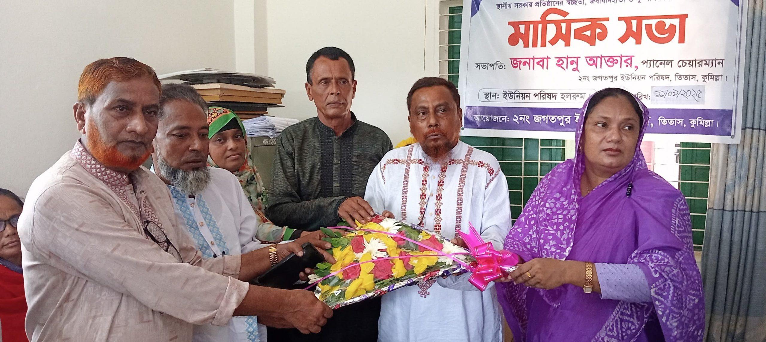 ১১ সেপ্টেম্বর বৃহস্পতিবার সকাল ১০টায় তিতাস উপজেলা জগতপুর ইউনিয়ন পরিষদের ভারপ্রাপ্ত চেয়ারম্যান হানু আক্তারের সভাপতিত্বে এবং ইউপি সচিব শাহজাহানের সঞ্চালনায় মাসিক সভা অনুষ্ঠিত হয়েছে।