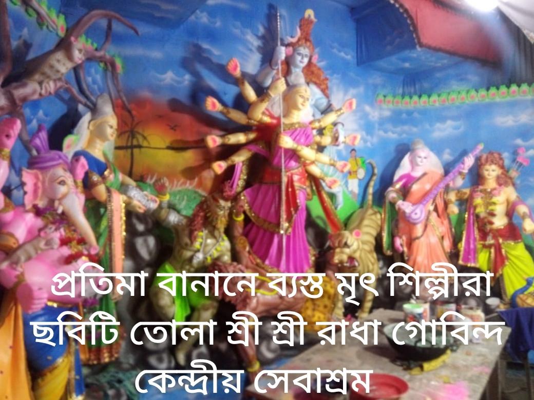 ইতিমধ্যে কোন কোন মন্ডপে মাটির কাজ প্রায় শেষ করে ফেলেছে শিল্পীরা। মূর্তি গড়া শেষে রং তুলির আঁচড়ে ফুটিয়ে তোলা হবে প্রতিমা। দেবীকে স্বাগত জানাতে সর্বত্র আনন্দঘন পরিবেশ বিরাজ করছে। হিন্দু সম্প্রদায়ের, নারী-পুরুষসহ সব বয়সী মানুষ এসর্ববৃৃহৎ শারদীয় উৎসবকে স্বার্র্থক করতে প্রহর শুনছে। সব মিলিয়ে ব্যাপক প্রস্ততি চলছে প্রতিটি পূজা মন্ডপে। ছবিটি তোলা শ্রী শ্রী রাধাগবিন্দ কেন্দ্রিয় শেবা শ্রম থেকে।