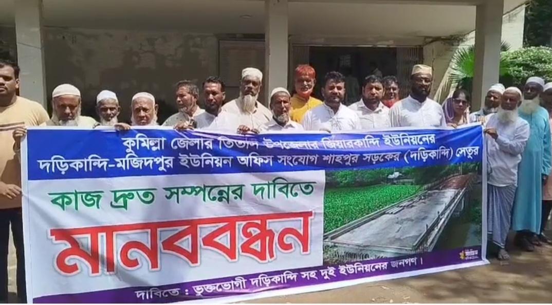 তিতাস উপজেলার দড়িকান্দী ব্রিজের কাজ সমাপ্তের দাবিতে মানববন্ধন এলাকাবাসীর