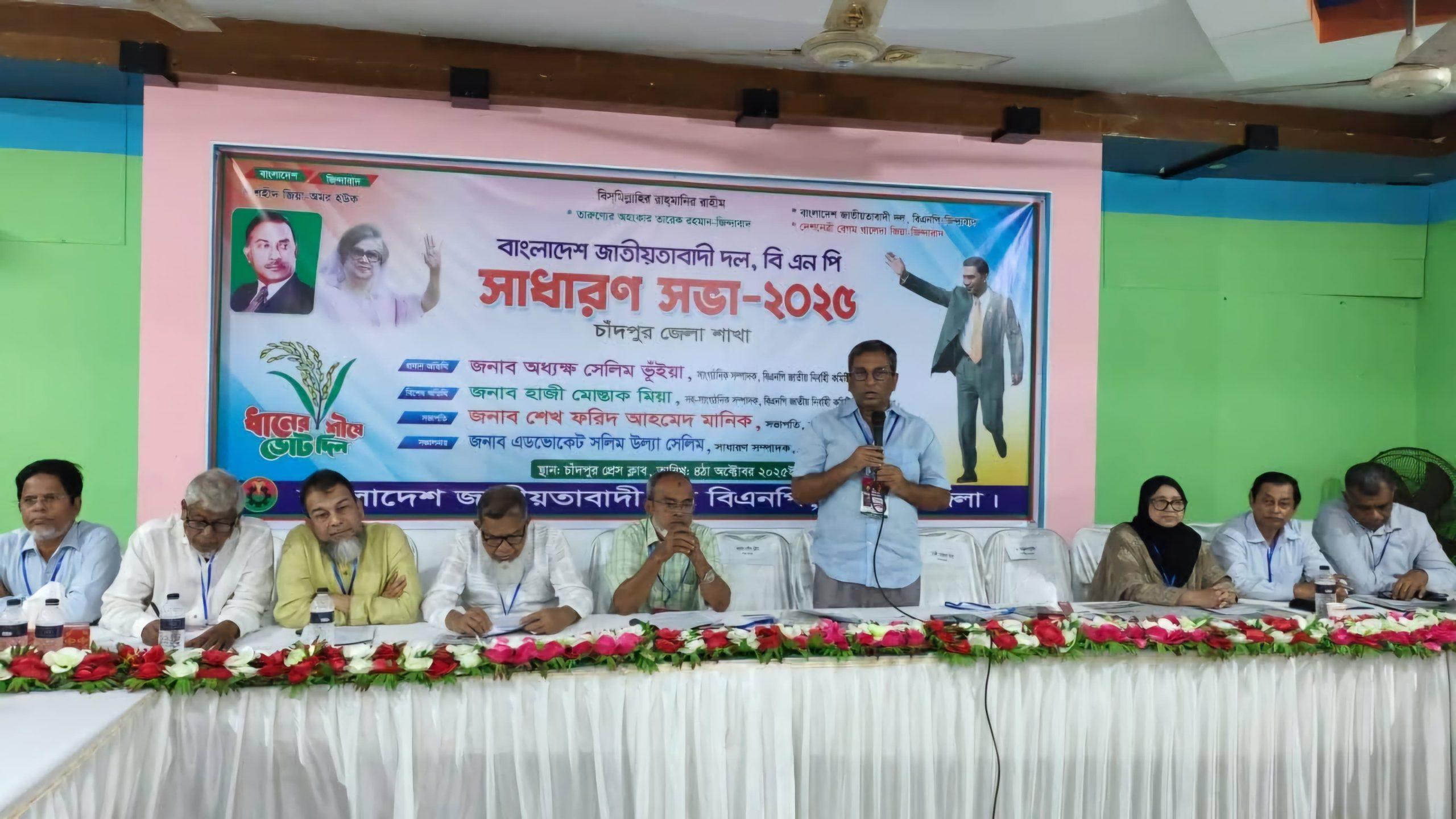 বাংলাদেশ জাতীয়তাবাদী দল (বিএনপি) চাঁদপুর জেলা শাখার সাধারণ সভায় তিনি এসব কথা বলেন। ৪ অক্টোবর শনিবার সকাল ১০টায় চাঁদপুর প্রেসক্লাবের নিচতলায় সভায় প্রধান অতিথির বক্তব্য রাখেন বিএনপি জাতীয় নির্বাহী কমিটি (কুমিল্লা বিভাগ) সাংগঠনিক সম্পাদক অধ্যক্ষ সেলিম ভূঁইয়া।