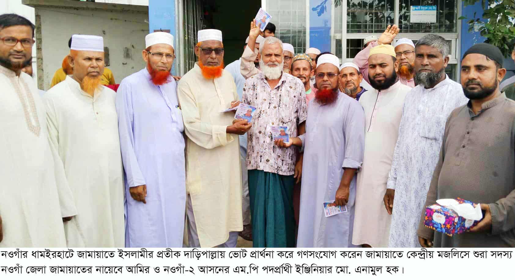 নায়েবে আমীর সাবেক ইউপি চেয়ারম্যান ও উপজেলা চেয়ারম্যান প্রার্থী মাওলানা আতাউর রহমান, সেক্রেটারি মাওলানা রেজোয়ান হোসেন, পৌর শাখার আমির মাওলানা ইসমাইল হোসেন, ১নং ধামইরহাট ইউনিয়ন আমীর মাওলানা ইউনুছার রহমান এবং বিভিন্ন ইউনিয়নের নেতৃবৃন্দ গণসংযোগে অংশ গ্রহন করেন। এমপি প্রার্থী ইঞ্জিনিয়ার এনামুল হক হ্যান্ডবিল বিতরণ ও আসন্ন নির্বাচনে দাড়ি পাল্লা মার্কায় ভোট প্রার্থনা করেন। গণসংযোগ শেষে বিকেল ৫ টায় ধামইরহাট বাজারের ঐতিহাসিক নিমতলী মোড়ে দাড়ি পাল্লা প্রতীকে ভোট প্রার্থনায় পথসভা অনুষ্ঠিত হয়।