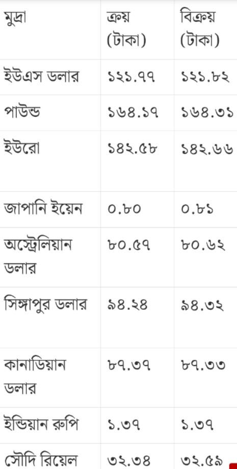 বাংলাদেশ ব্যাংকের তথ্য অনুসারে, মঙ্গলবার দেশের মুদ্রা বাজারে ডলার কেনার দাম ধরা হচ্ছে ২১.৭৭ টাকা। বিক্রির দাম ২১.৮২ টাকা। গড় বিনিময় হার ১২১ টাকা ৭৭ টাকা। ইউরো কেনার ক্ষেত্রে দাম ধরা হয়েছে ১৪২ টাকা ৫৮ পয়সা এবং বিক্রির ক্ষেত্রে দাম ধরা হয়েছে ১৪২ টাকা ৬৬ পয়সা। মুদ্রার বিনিময় হার পরিবর্তন হতে পারে।