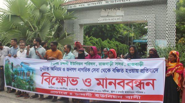 প্রিয়া আক্তার রাজবাড়ীতে সদর উপজেলার ১৩নং চন্দনী ইউনিয়ন পরিষদের দুর্নীতি অনিয়ম ও জনগণ নাগরিক সেবা থেকে বঞ্চিত হওয়ার প্রতিবাদে বিক্ষোভ ও মানববন্ধন অনুষ্ঠিত হয়েছে৷ রোববার (২১ সেপ্টেম্বর) সকাল ১১ টার