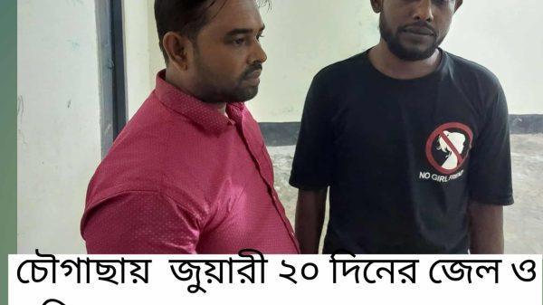উৎপল ঘোষ, যশোরের চৌগাছায় প্রকাশ্যে জুয়া খেলা অপরাধে শান্তি ভোলা (৩৫) ও হাফিজুর রহমান (৩১) মোবাইল কোটোর মাধ্যমে ২০ দিনের জেল ও ২০০ টাকা জরিমানা করেন। উপজেলার হাকিমপুর ইউনিয়ন হাজিপুর