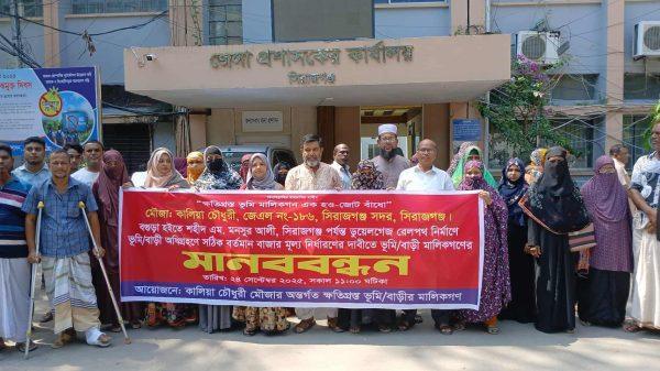 তারিকুল আলম বগুড়া থেকে সয়দাবাদ শহিদ এম.মনসুর আলী ষ্টেশন সিরাজগঞ্জ পর্যন্ত ডুয়েলগেজ রেলপথ নির্মাণ প্রকল্পে কালিয়া চৌধুরী মৌজার অধিগ্রহণকৃত সম্পত্তির সঠিক মূল্য নির্ধারণের দাবীতে মানববন্ধন